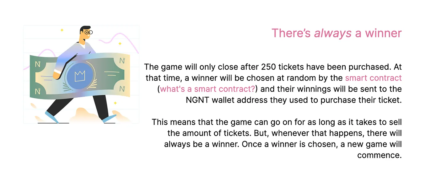 - Get your winnings: If you win, your NGNT will be automatically sent to the address you used to purchase your tickets. You don’t need to do anything to collect your winnings! The exact prize amount will be a little over 110,000 NGNT.